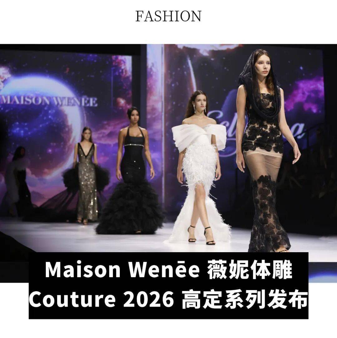 10 月 12 日,Maison Wenēe 薇妮体雕 Couture 在上海时装周呈现一场名为“平行宇宙 · 曜时镜域”的大秀。29 套 Maison Wenēe 薇妮体雕 Couture 高定礼服在柔光中缓缓登场——立体剪裁塑造雕塑般的廓形,精湛手工让光线在布料间自由流动。黑色蕾丝花卉布覆盖于肤色细纱之上,呈现若隐若现的高级透肤效果。上千片亮片与缝珠宛如星辰般倾泻而下,以镜面亮片塑造璀璨的视觉张力,随着每一次呼吸与步伐,折射出宛如星河闪耀的光晕。演员陶红、王奕婷、赵昕、杜雨宸等多位明星好友悉数亮相,共同聆听这场关于女性与光的浪漫回声。(Lee)WWD