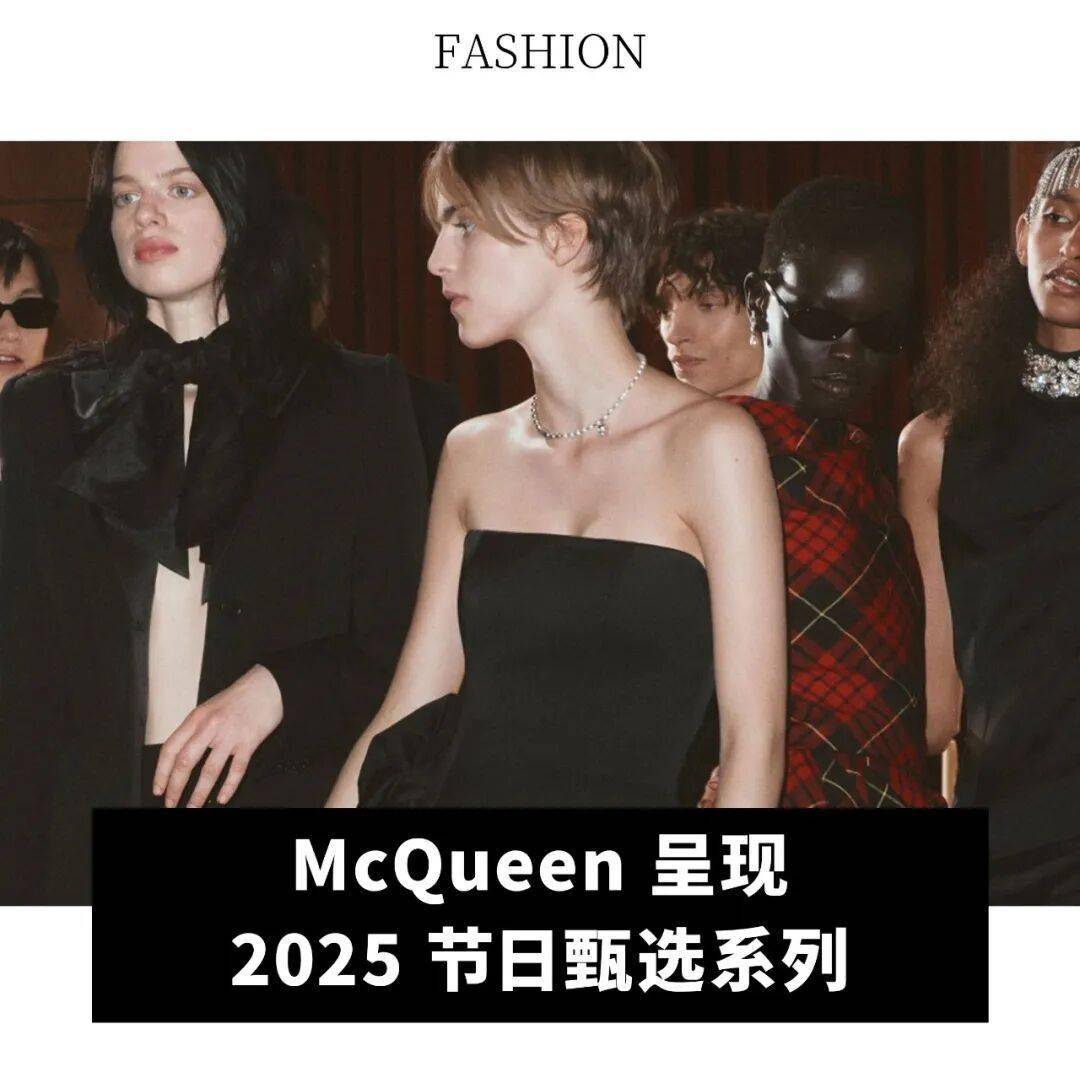 派对的灵魂人物,置身于恢弘的埃尔特姆宫之中(Eltham Palace),在标志性的配饰与鞋履的精妙搭配中定格风采。不拘泥于传统形式,夺目的金属装饰与华丽的质感在此碰撞,迸发出生动的活力。 深酒红天鹅绒与缎面礼裙,镶嵌珠宝的领口、以鲜艳欲滴的红色蛛网蕾丝点缀。水晶镶嵌的 Knuckle Clutch 手拿包,为节日庆典注入璀璨光芒。金属感 Skull Flower 手袋和节日气氛的缎面凉鞋以闪耀的水晶蝴蝶结华丽装饰。现代与古典在此交融,呈现全新风格。燕尾服剪裁与标志性的 McQueen 元素以颠覆性的创意融合:不对称的“MacQueen”格纹,饱含立体拆解细节的精致蕾丝。精裁设计旨在完成从街头穿搭到私密狂欢场景的微妙转换,混搭日装和露肤的水晶装饰针织单品。 珠宝设计强化了颠覆性的视觉效果与戏剧张力。精致的珍珠勾勒出标志的骷髅造型,Manta 手袋则是对档案馆经典廓形的完美再现,经雕塑般重塑后,饰以碎裂水晶吊灯与角色灵感吊坠。(Lee)