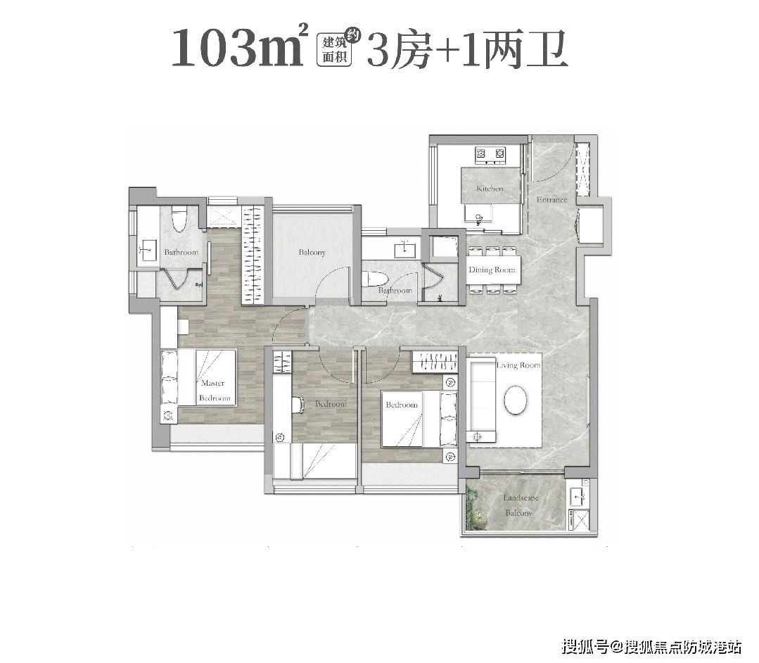 103㎡四居两卫户型:该户型布局方正,南北通透,采光通风效果极佳。客厅采用大面宽设计,连接观景阳台,拓展了室内空间视野,同时让阳光与新鲜空气充分涌入室内。四个房间布局合理,动静分区明确,主卧配备独立卫生间与衣帽间,保障了主人的私密性与舒适性;其余三个房间面积适中,可根据家庭需求改造为儿童房、老人房或书房。厨房采用U型设计,操作空间充足,动线合理,方便日常烹饪;公共卫生间干湿分离,提升了使用效率与卫生程度。该户型实用率高达93-96%,空间利用率高,能够满足三口之家或四口之家的居住需求。